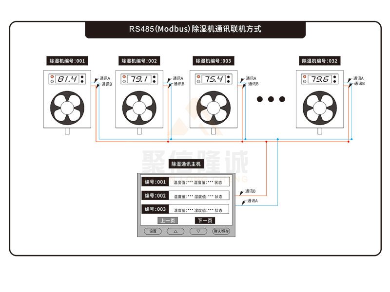系統主要由:一臺主機和若干臺(1~32臺)抽濕器子機構成;抽濕器子機主要負責數據采集、環境控制和數據上傳;主機主要負責:數據分析、數據保存和相關參數設置。主機與抽濕器子機之間采用485通訊連接。